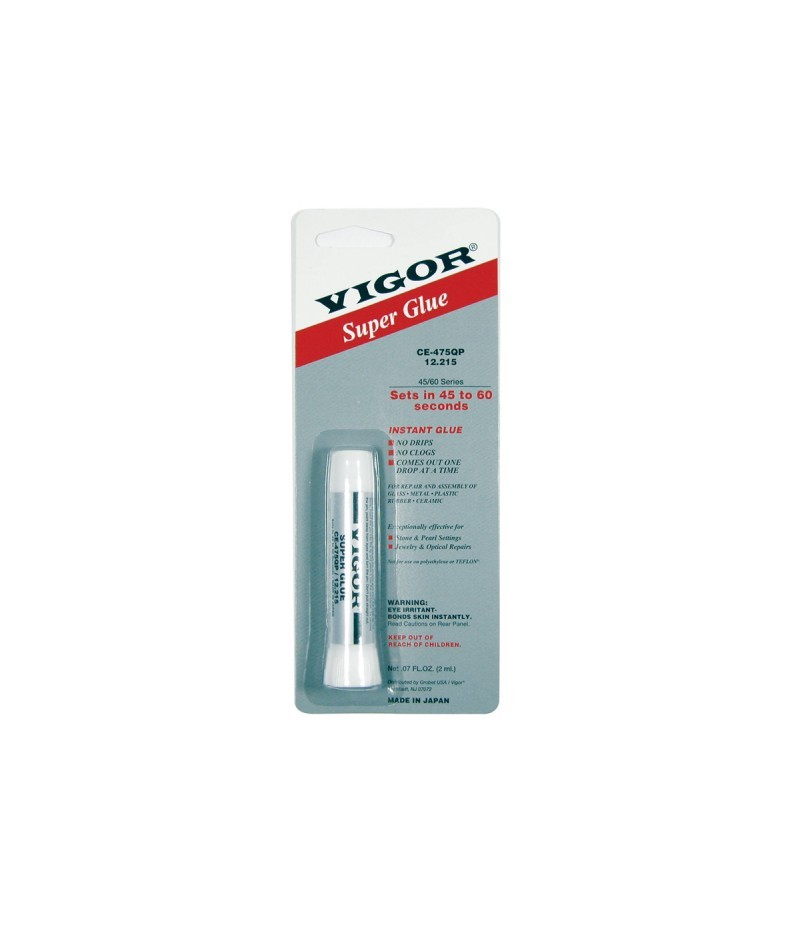 VIGOR®SUPER GLUES Adhesivo de cianoacrilato fuerte que une cualquier combinación de metal, plástico, caucho, cerámica o vidrio. Se fija y cura rápidamente en la habitación. Alta resistencia a productos químicos y bajas temperaturas. No requiere tratamiento de superficie más allá de la temperatura de limpieza. Bond es incoloro y transparente y casi no se contrae. La baja viscosidad asegura una distribución uniforme en toda el área de unión utilizando una cantidad mínima de pegamento.
