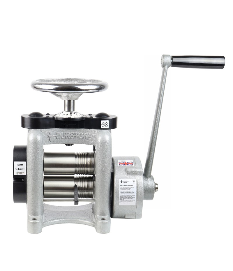El laminador Durston DRM C130R incorpora caja de engranajes (reductor de fuerza) autolubricante, relación 5 a 1, que ofrece la máxima eficiencia al laminar metales de hasta 6 mm o alambre de hasta 8 mm. Los rodillos de precisión endurecidos de 130 mm cuentan con 11 pasos de alambre cuadrado de 8 a 1 mm y un área de laminación plana de 75 mm (ancho total del rodillo: 130 mm).
