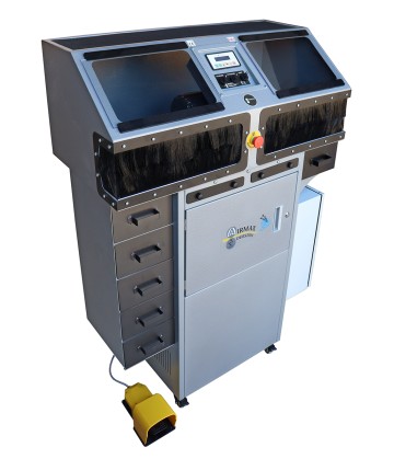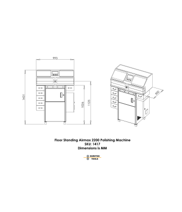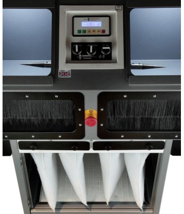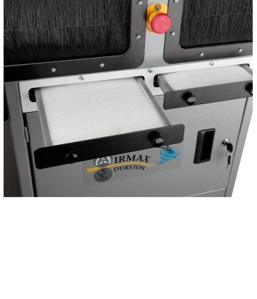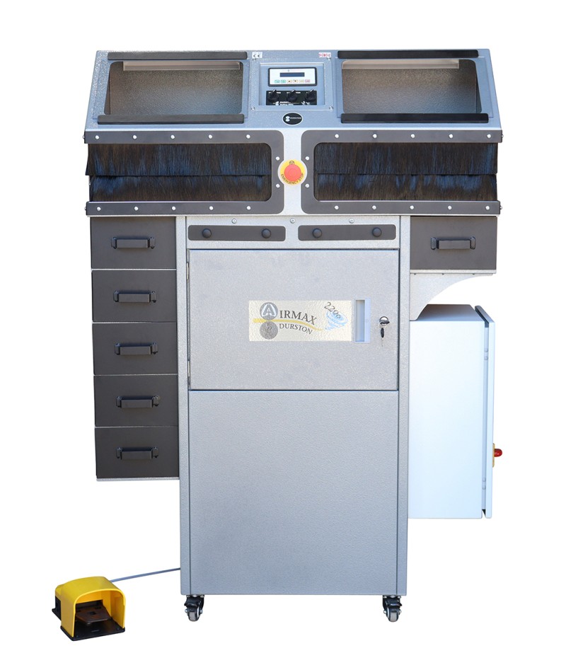 100% reciclado. La unidad también cuenta con dos prácticos cajones a ambos costados del soporte. La Airmax 2200 mide 100 cm de ancho x 50 cm de largo x 144 cm de alto; además, el cuadro eléctrico trasero sobresale 20 cm más, lo que supone un total de 70 cm de largo. La base mide 57 cm de ancho x 46 cm de largo. La Air Max 2200 también está equipada con ruedas para facilitar su transporte y desplazamiento por el taller y está fabricada con una robusta estructura de acero de 2 mm. La unidad incluye luces de trabajo en ambos lados de pulido, una alfombrilla de almacenamiento en la parte superior y un botón de parada de emergencia en la parte frontal. Como es de esperar de Durston, todos sus componentes son de primera línea y están diseñados para larga duración. El motor es monofásico de 220 Volts, y sus dimensiones son de 990 mm de ancho x 500 de largo mm x 500 mm de alto. Sin embalaje, la unidad pesa 112 kg.-